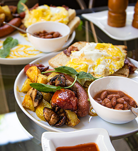 نان تست، تخم مرغ، سیب زمینی، لوبیاچیتی، گوجه، قارچ، سوسیس، بیکن